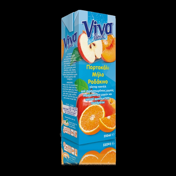Υπέροχος, απολαυστικός χυμός από εκλεκτά πορτοκάλια, μήλα και ροδάκινα. Διατηρεί τη γεύση και το άρωμα των φρούτων μέχρι την τελευταία σταγόνα. Συστατικά: Χυμός από συμπυκνωμένο χυμό πορτοκαλιού και μήλου, Πολτός από συμπυκνωμένο πολτό ροδάκινου, νερό ζάχαρη και κιτρικό οξύ (μέσο όξυνσης). Συνολική περιεκτικότητα σε φρούτα 50% τουλάχιστον.